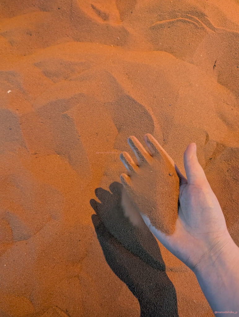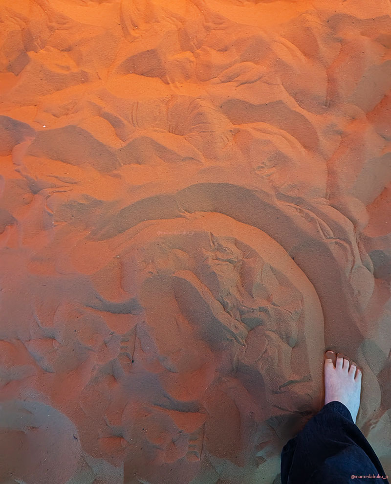 裸足で歩く砂漠の砂。ひんやりとしていて心地が良い。