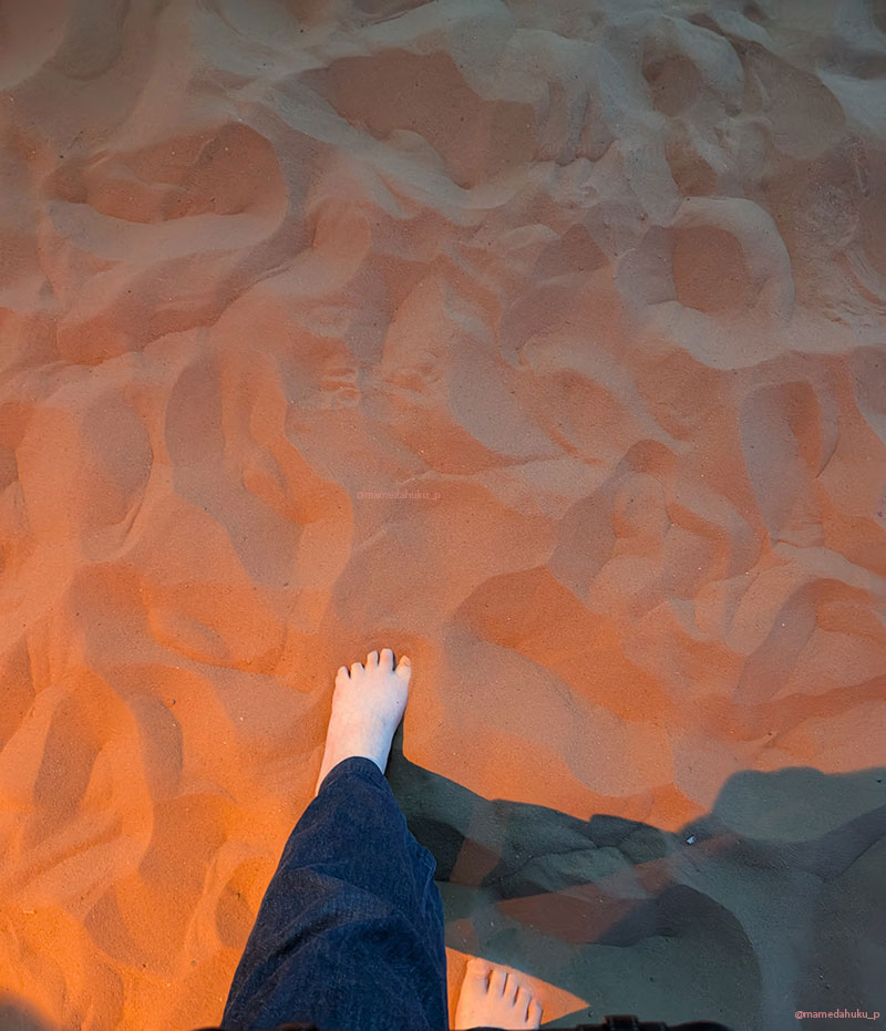 裸足で歩く砂漠の砂。ひんやりとしていて心地が良い。