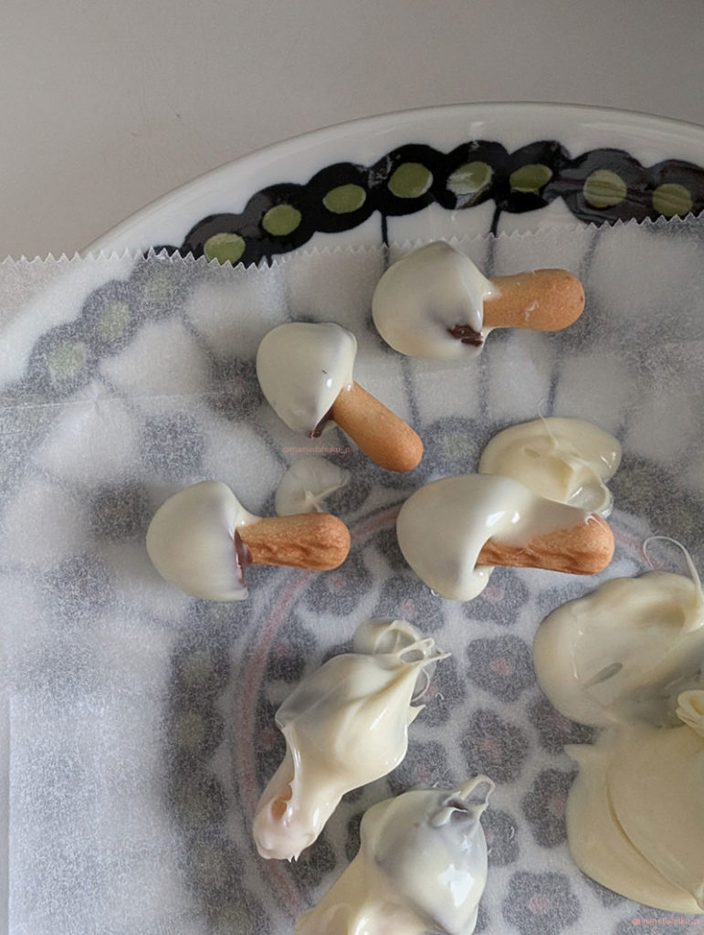 ホワイトチョコをテンパリング(温度調整)で溶かして、きのこの山をくぐらせて、あとは固まるのを待つだけ。