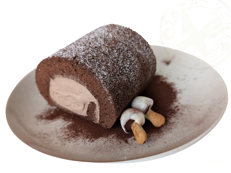 さすがにロールケーキ内の材料にキノコを使うのは難しいので、普通にチョコクリームで。