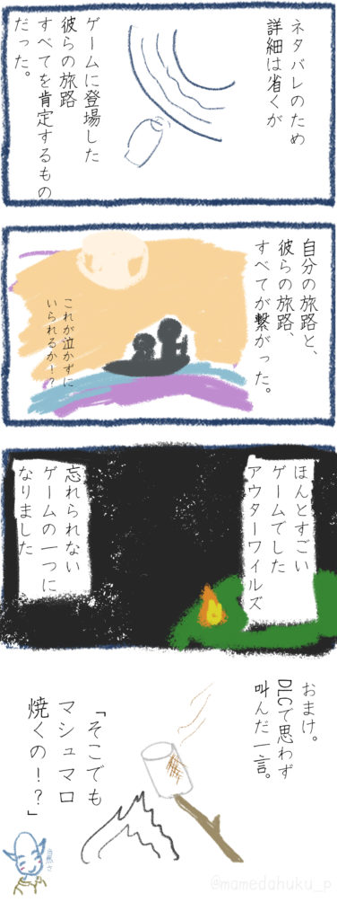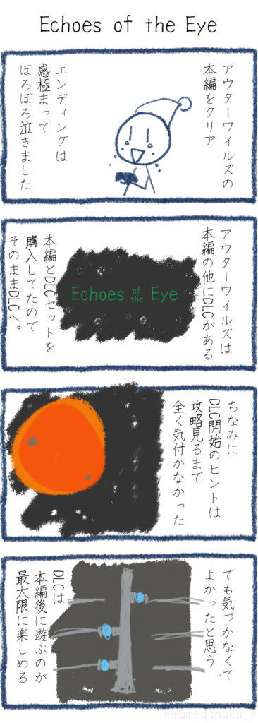 「Outer Wilds」の追加DLC「Echoes of the Eye」のネタバレ無し感想 Outer Wilds 2023.11.112023.05.28 いままで遊んだ中で一番怖いゲームだったかもしれない。でもその恐怖があったからこそ、とんでもないゲーム体験を味わえた。